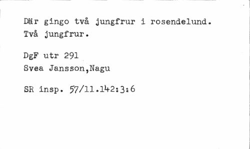 //// Där gingo två jungfrur i rosendelund. Två jungfrur. //// DgF utr 291 Svea Jansson,Nagu //// SR insp. 57/11.11*2*3»6 ////