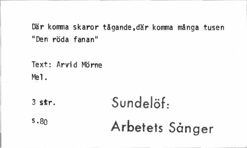 //// Där komma skaror tågande,där komma många tusen "Den röda fanan" //// Text.: Arvid Mörne Mel. //// 3 str. Sundelöf: //// 5,80 Arbetets Sånger ////