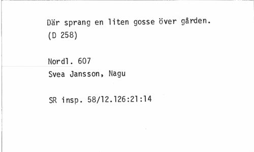 //// Där sprang en liten gosse över gården. (D 258) //// Nordl. 607 //// Svea Jansson, Nagu //// SR insp. 58/12.126:21:14 ////