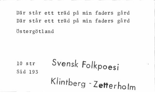 //// Där står ett träd på min faders gård Där står ett träd på min faders gård //// Östergötland //// 10 str Svensk Folkpoesi //// Sid 193 //// Klinfberg -Zetterholm ////