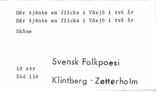 //// Där tjänte en flicka i Växjö i två år Där tjänte en flicka i Växjö i två år //// Skåne //// Svensk Folkpoesi //// 10 str //// Sld 154 Klintberg - Zetterholm ////