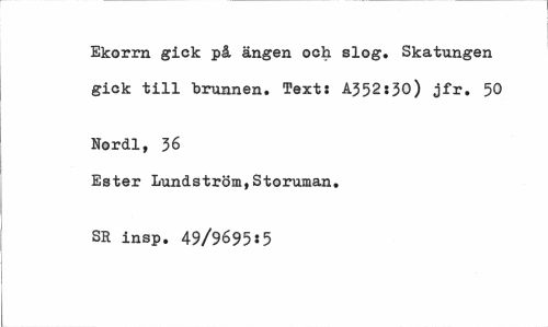 //// Ekorrn gick på ängen och slog. Skatungen gick till "brunnen. Text: A352:30) jfr. 50 //// Nordl, 36 //// Ester Lundström,Storuman. SR insp. 49/9695:5 ////