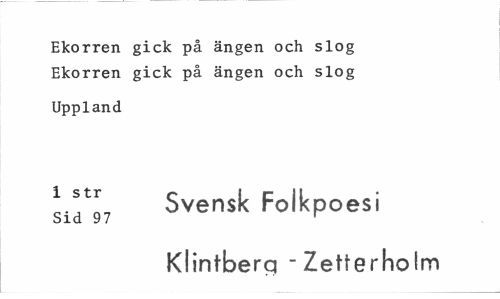 //// Ekorren gick på ängen och slog Ekorren gick på ängen och slog //// Uppland //// t-^L Svensk Folkpoesi //// Sid 97 r //// Klintberg - Zetferholm ////