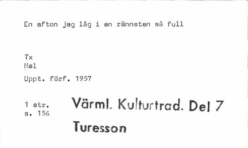 //// En afton jag låg i en rännsten så full //// Tx //// Mel //// Uppt. förf. 1957 //// 1 str. VärmL Kulfrurtrad. Del 7 //// s. 1 56 //// Turesson ////