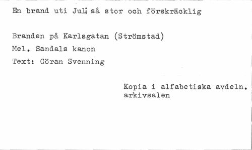//// En brand, uti Juli så stor och förskräcklig //// Branden på Karlsgatan (Strömstad) Mel. Sandals kanon Text: Göran Svenning //// Kopia i alfabetiska avdeln. arkivsalen ////