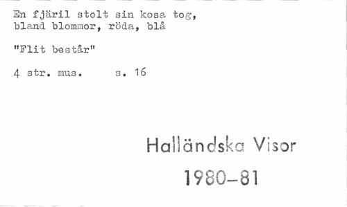//// En fjäril stolt sin kosa tog, bland blommor, röda, blå //// "Flit består" //// 4 str. mus. s. 16 //// Halländska Visor //// 1980-81 ////
