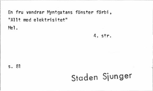 //// En fru vandrar Myntgatans fönster förbi, //// "Allt med elektrisitet" //// Mel. //// 4. str. //// s. 81 //// Staden Sjunger ////