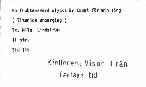 //// En fruktansvärd olycka är ämnet för min sång //// ( Ti tanics undergång ) //// Tx. Nils Lindström //// 11 str. //// Sid 115 //// K felinrerv. Visor f rån farfar5 tid ////