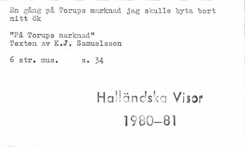 //// En gång på Torups marknad jag skulle byta bort mitt ök //// "På Torups marknad" Texten av K.J. Samuelsson //// 6 str. mus. s. 34 //// Halländska Visor 1980-81 ////