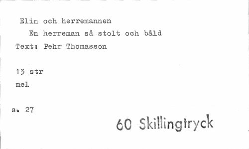 //// Elin och herremannen //// En herreman så stolt och båld Texts Pehr Thomasson //// 13 str mel //// Si 27 //// 6C Skillingtryck ////