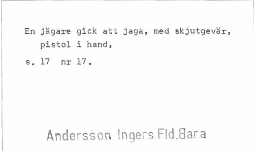 //// En jägare gick att jaga, med skjutgevär, pistol i hand, //// s. 17 nr 17 . //// Andersson logers Fld.Bara ////