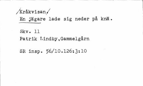 //// /kr åk vi san/ En jägare lade sig neder på knä. //// Skv. 11 //// Patrik T.indby,Gammelgårn SR insp. 56/10.126:3*. 10 ////