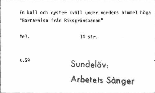 //// En kall och dyster kväll under nordens himmel höga "Borrarvisa från Riksgränsbanan" //// Mel. 14 str. //// s.59 c \ !•• //// oundelov: Arbetets Sånger ////