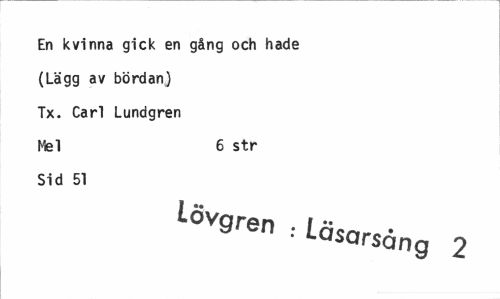 //// En kvinna gick en gång och hade (Lägg av bördan) Tx. Carl Lundgren Mel 6 str //// Sid 51 //// ^n - Läsorsång 2 ////