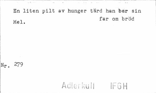//// En liten pilt av hunger tärd han ber sin //// . far om bröd //// Mel. //// Nr. 279 //// Adlerkull IFGH ////