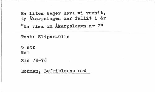 //// En liten seger hava vi vunnit, ty Åkarpslagen har fallit i år //// "En visa om Åkarpslagen nr 2M //// Text: Slipar-Olle //// 5 str Mel //// Sid 74-76 //// Bohman, Befrielsens ord_ ////