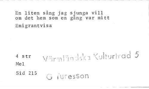 //// En liten sång jag sjunga vill om det hem som en gång var mitt //// Emigrantvisa //// 4 str V^rnHndUki Xuhurhad 5 //// Mel //// Sid 215 //// O juresSon ////