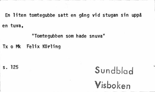 //// En liten tomtegubbe satt en gång vid stugan sin uppå en tuva, //// "Tomtegubben som hade snuva" Tx o Mk Felix Körling //// s' 125 Sundbiod //// Visboken ////