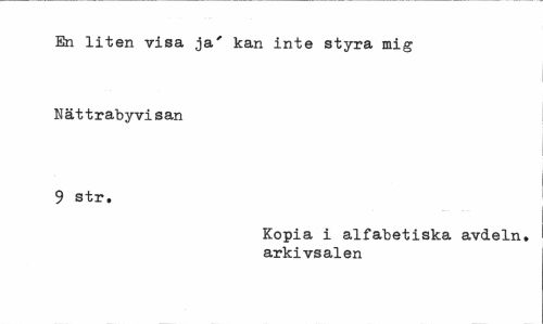//// En liten visa ja' kan inte styra mig Nättrabyvisan //// 9 str. //// Kopia i alfabetiska avdeln. arkivsalen ////