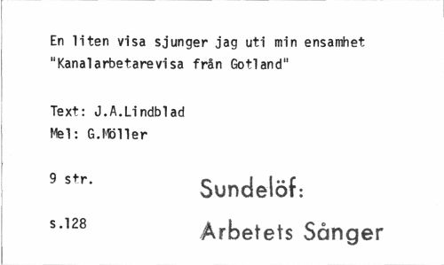 //// En liten visa sjunger jag uti min ensamhet "Kanal arbetare vi sa från Gotland" //// Text: J.A.Lindblad Mel: G.Möller //// 9 5tr' Sundelöf: //// s '28 Arbetets Sånger ////