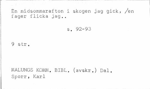 //// En midsommarafton i skogen jag gick, /en fager flicka jag.. //// s. 92-93 //// 9 str. //// MALUNGS KOMM. BIBL. (avskr.) Dal. Sporr3 Karl ////