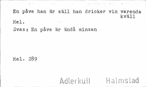 //// En påve han är säll han dricker vin varenda //// kväll //// Mel. //// Svas: En påve är ändå minsan Mel. 289 //// Adierkuii Halmstad ////