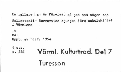 //// En rallare han är förvisst så god som någon ann //// Rallartrall- Borrarvisa sjungen före sekelskiftet i Värmland //// Tx Mel //// Uppt. av förf. 1954 //// 4 str. . . . //// ^ 226 Varml. Kumjrtrad. Del 7 //// Turesson ////