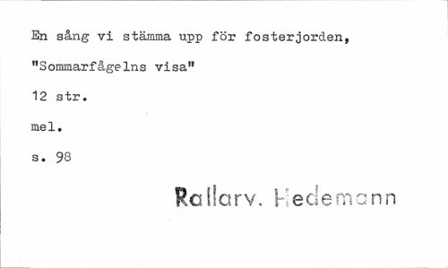 //// En sång vi stämma upp för fosterjorden, //// "Sommarfågelns visa" //// 12 str. //// mel. //// s. 98 //// Rallcrv. Hedemann ////