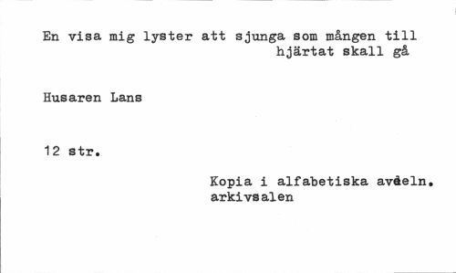 //// En visa mig lyster att sjunga som mången till //// hjärtat skall gå //// Husaren Lans 12 str. //// Kopia i alfabetiska avåeln, arkivsalen ////