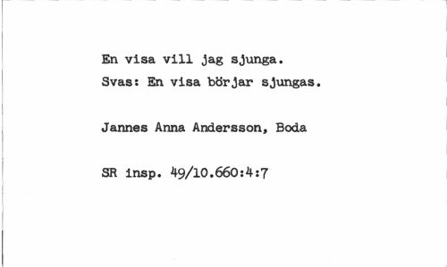 //// En visa vill jag sjunga. Svas: En visa börjar sjungas. //// Jannes Anna Andersson, Boda //// SR insp. 49/10.660:4:7 ////