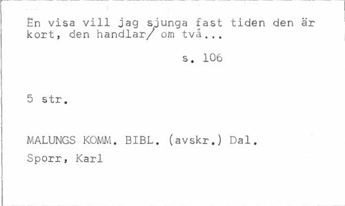 //// En visa vill jag sjunga fast tiden den är kort, den handlar/ om två... //// s. 106 //// 5 str, //// MALUNGS KOMM. BIBL. (avskr.) Dal. Sporr, Karl ////