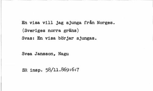 //// En visa vill jag sjunga från Norges. //// (Sveriges norra gräns) //// Svas: En visa börjar sjungas. //// Svea Jansson, Nagu SR insp. 58/11.869:6:7 ////