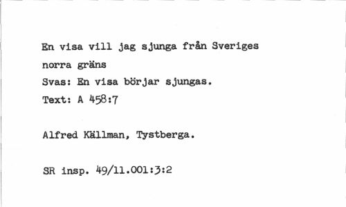 //// En visa vill jag sjunga från Sveriges norra gräns //// Svas: En visa börjar sjungas. Text: A 458:7 //// Alfred Källman, Tystberga. SR insp. 49/11.001:3:2 ////