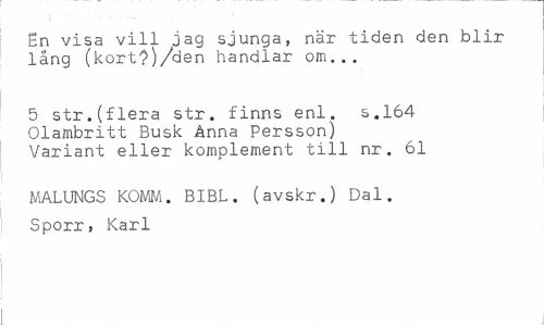//// En visa vill jag sjunga, när tiden den blir lång (korf?)/den handlar om... //// 5 str.(flera str. finns enl. s.164 Olambritt Busk Anna Persson) Variant eller komplement till nr. 61 //// MALUNGS KOMM. BIBL. (avskr.) Dal. Sporr, Karl ////