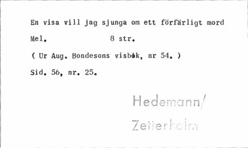 //// En visa vill jag sjunga om ett förfärligt mord Mel. 8 str. //// ( Ur Aug. Bondesons visbék, nr 54. ) Sid. 56t nr. 25. //// Hedern ann / Zetierhc !rn ////