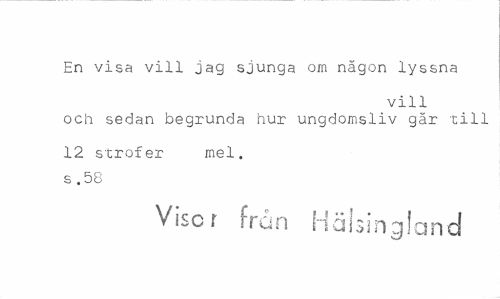 //// En visa vill jag sjunga om någon lyssna //// vill //// och sedan begrunda hur ungdomsliv går till //// 12 strofer mel. //// s .58 //// Visor från Hälsingland ////