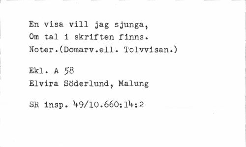//// En visa vill jag sjunga, Om tal i skriften finns. Noter.(Domarv.ell. Tolvvisan.) //// Ekl. Å 58 //// Elvira Söderlund, Malung SR insp. ^-9/10.660:1*+; 2 ////