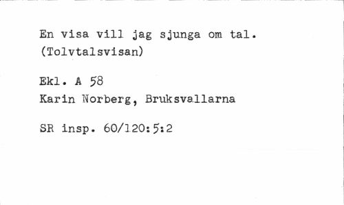 //// En visa vill jag sjunga om tal. (Tolvtalsvisan) //// Ekl. A 58 //// Karin Norberg, Bruksvallarna SR insp. 60/120:5:2 ////