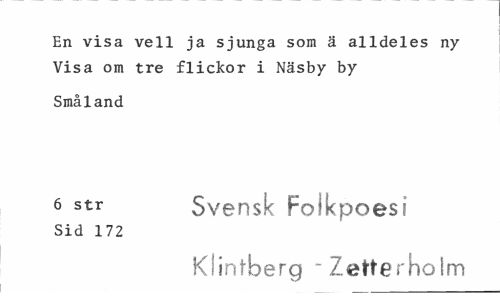 //// En visa vell ja sjunga som ä alldeles ny Visa om tre flickor i Näsby by //// Småland //// 6 str Svensk Folkpoesi //// Sid 172 //// Klintberg "Zetterholm ////