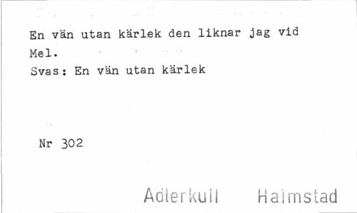 //// En vän utan kärlek den liknar jag vid Mel. //// Svas: En vän utan kärlek Nr 302 //// Aöferkuij Halmstad ////