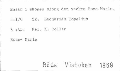 //// Ensam I skogen sjöng den vackra Rose-Marie, s.I70 Tx. Zacharias Topelius 3 str. Mel. K. Collan Rose- Marie //// Röda Visboken 1969 ////