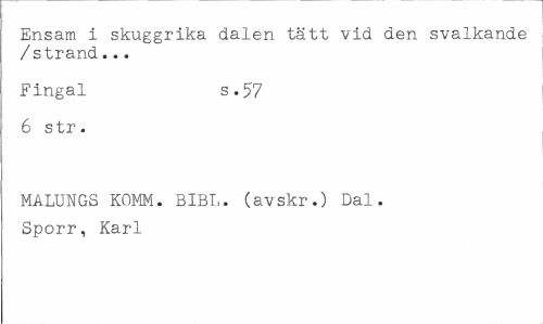//// Ensam i skuggrika dalen tätt vid den svalkande /strand... //// Fingal s .57 //// 6 s tr. //// MALUNGS KOMM. BIBI,, (avskr.) Dal. Sporr, Karl ////