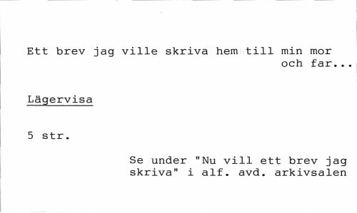 //// Ett brev jag ville skriva hem till min mor //// och far... //// Lägervisa 5 str. //// Se under "Nu vill ett brev jag skriva" i alf. avd. arkivsalen ////