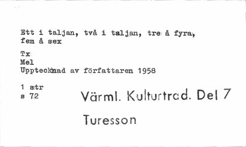 //// Ett i täljan, två i taljan, tre å fyra, fem å sex //// Tx Mel //// Upptecknad av författaren 1958 //// 1 Sft»3? //// b 72 Värml. Kulturtrcd. Del 7 Turesson ////