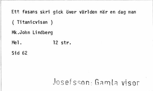 //// Ett fasans skri gick över världen när en dag man //// ( Titanicvisan ) //// Mk.John Lindberg //// Mel. 12 str. //// Sid 62 //// Josefsson: Gamla visor ////