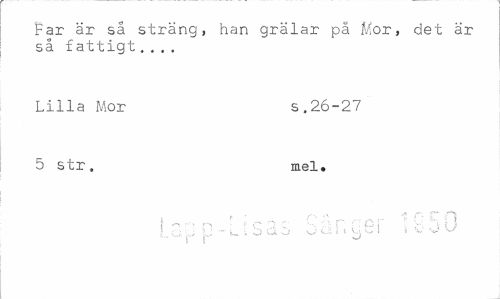 //// Far är så sträng, han grälar på Mor, det är så fattigt... //// Lilla Mor s.26-27 //// 5 str. mel. //// 1 - n P -' [ S a S v) cl r. Q G i li v >J u ' - r r ~ ^ ////