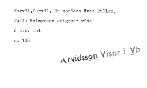//// Farväl,farväl, du nordens Svea kullar, Tekla Holmgrens emigrant visa 6 str. mel s. 106 //// Ary,d$sonVUor->^ ////