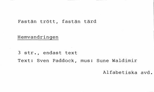 //// Fastän trött, fastän tärd Hemvandringen 3 str., endast text //// Text: Sven Paddock, mus: Sune Waldimir //// Alfabetiska avd. ////