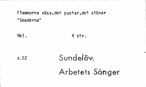 //// Flammorna väsa,det pustar,det stönar "Smederna" //// Mel. 4 str. //// s.52 Sundelöv. //// Arbetets Sånger ////