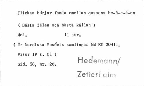 //// Flickan börjar famla emellan gossens be-å-e-å-en //// ( Bästa fålen och bästa källan ) Mel. 11 str. //// ( Ur Nordiska Museets samlingar NM EU 20411, Visor IV s. 81 ) //// Sid. 58. nr. 26. Hedernann/ //// ZeiterKclm ////